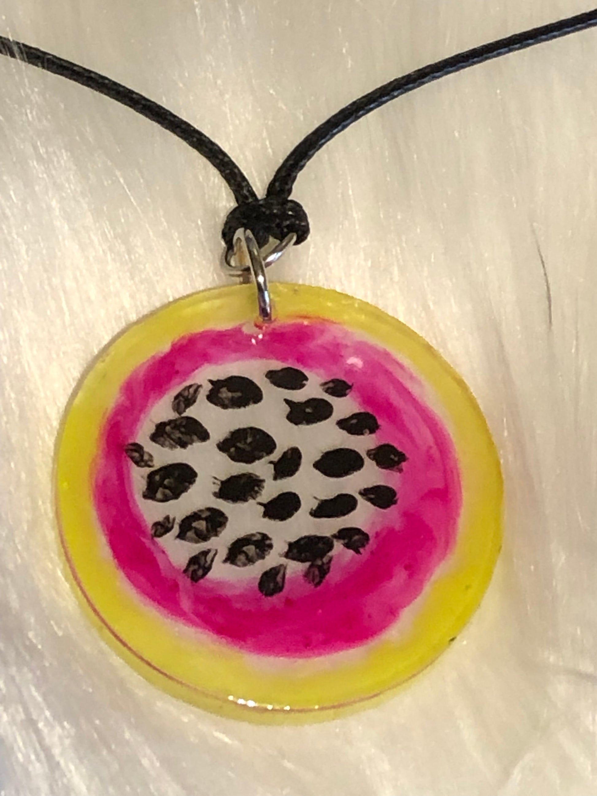 Black leather waxy necklace with tri-color hand painted resin pendant. One of a kind.