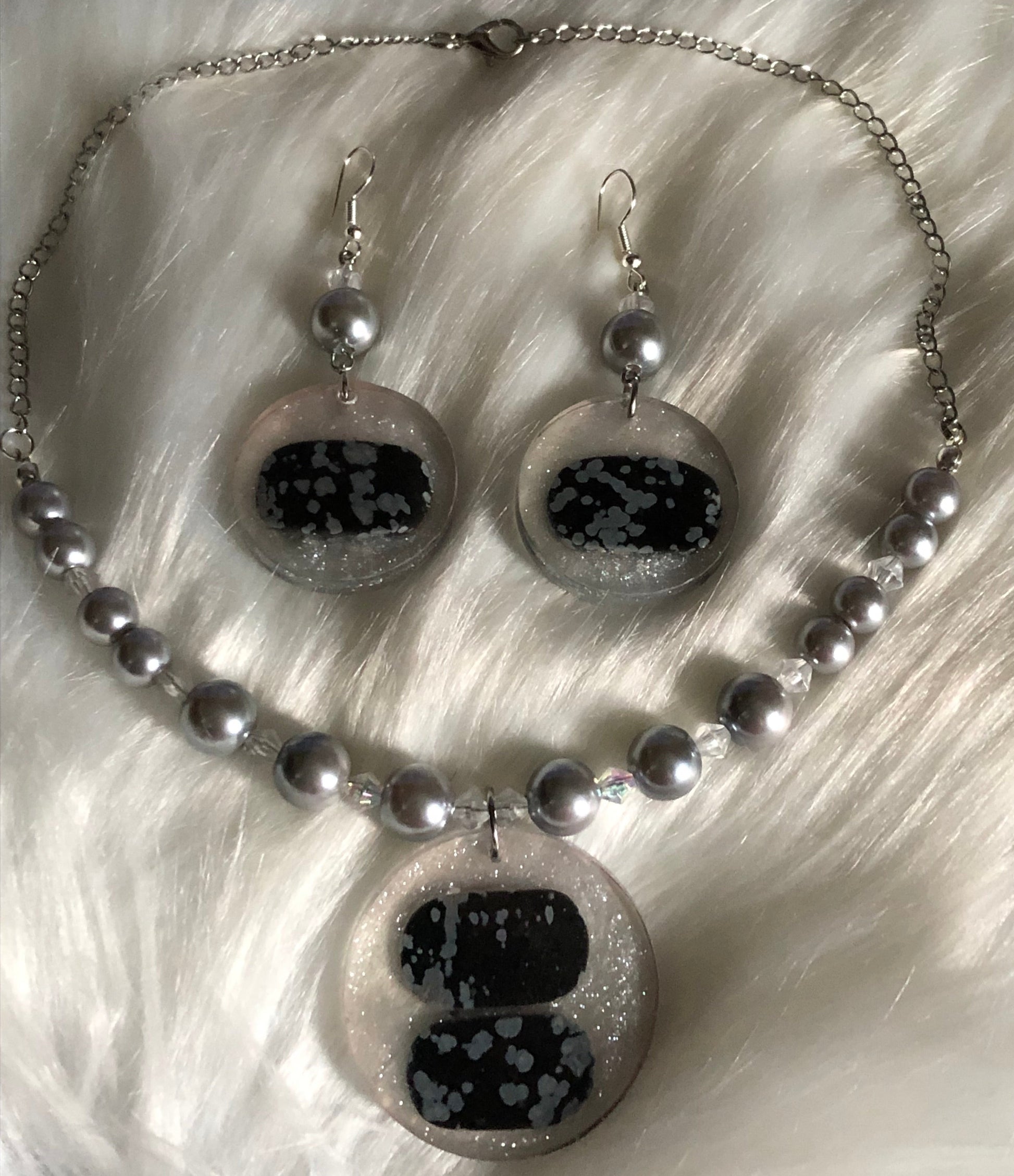 Silver pearls and iridescent Bicone beads with resin pendant. One of a kind.