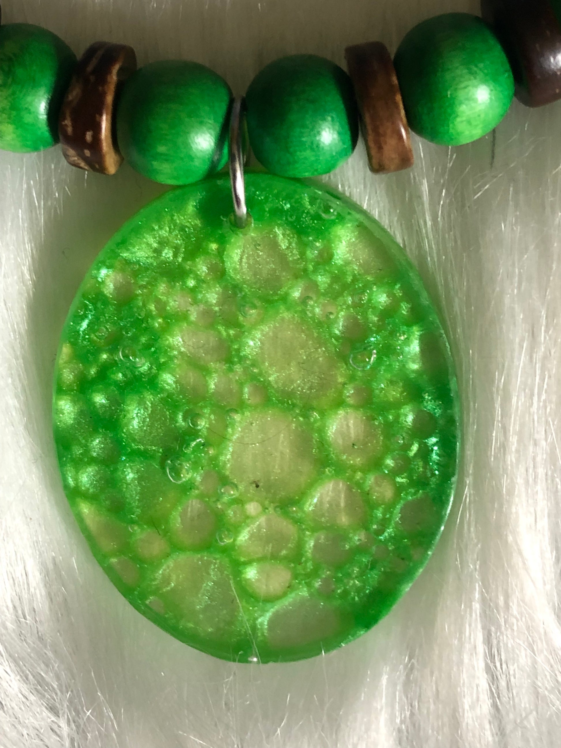 Wooden green and brown beads with bubbled resin pendant. One of a kind.