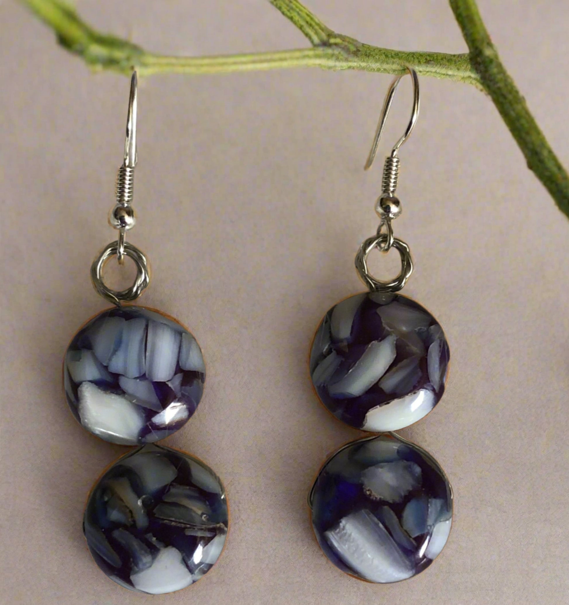 Hand-wired pendant and earrings set with Mother of Pearl shell flat beads and round pearly purple bead.