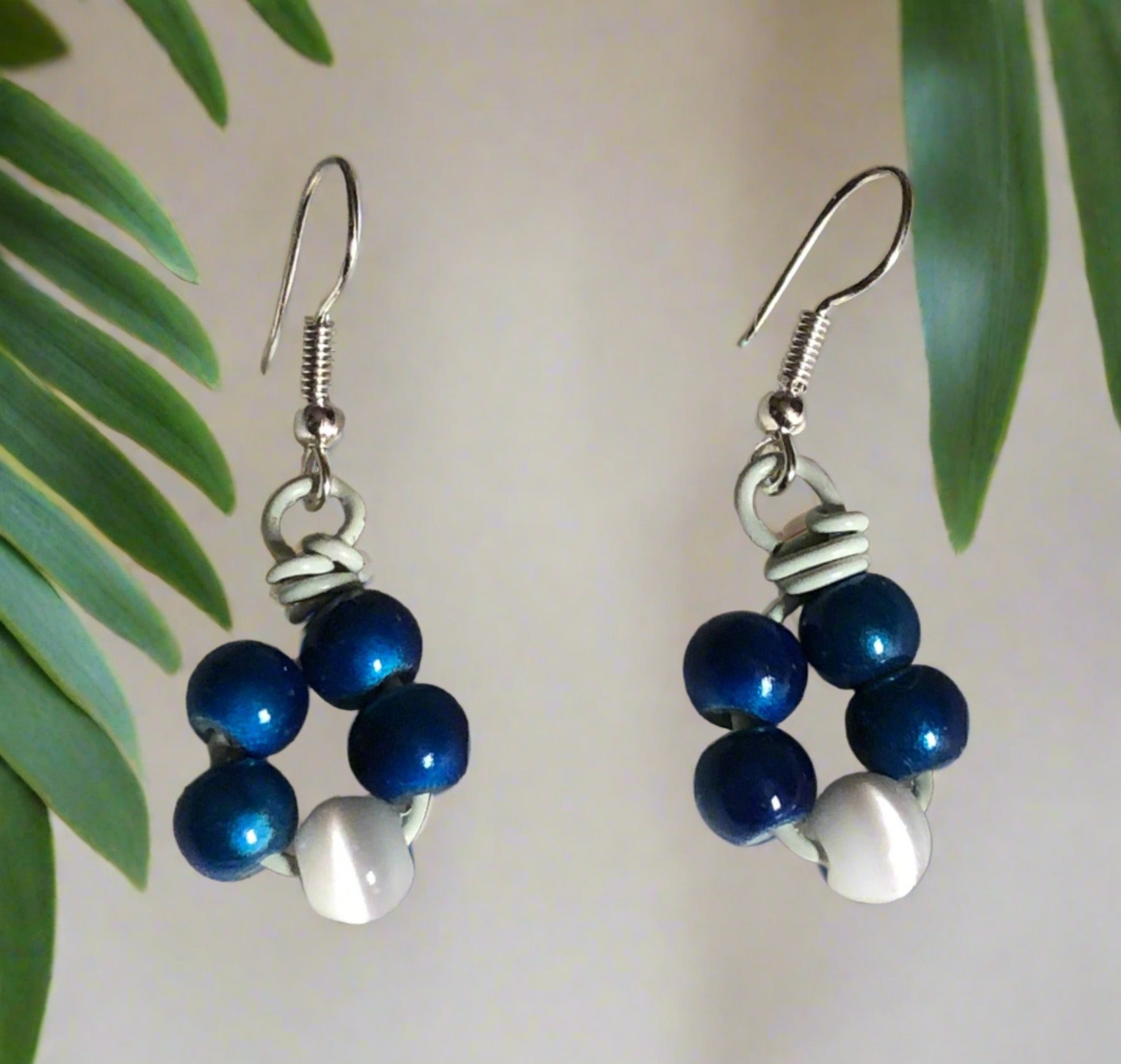 Hand-wired necklace with blue miracle beads and white cat's eye beads that have been wired wrapped in loops with unique wired pendant. One of a kind.