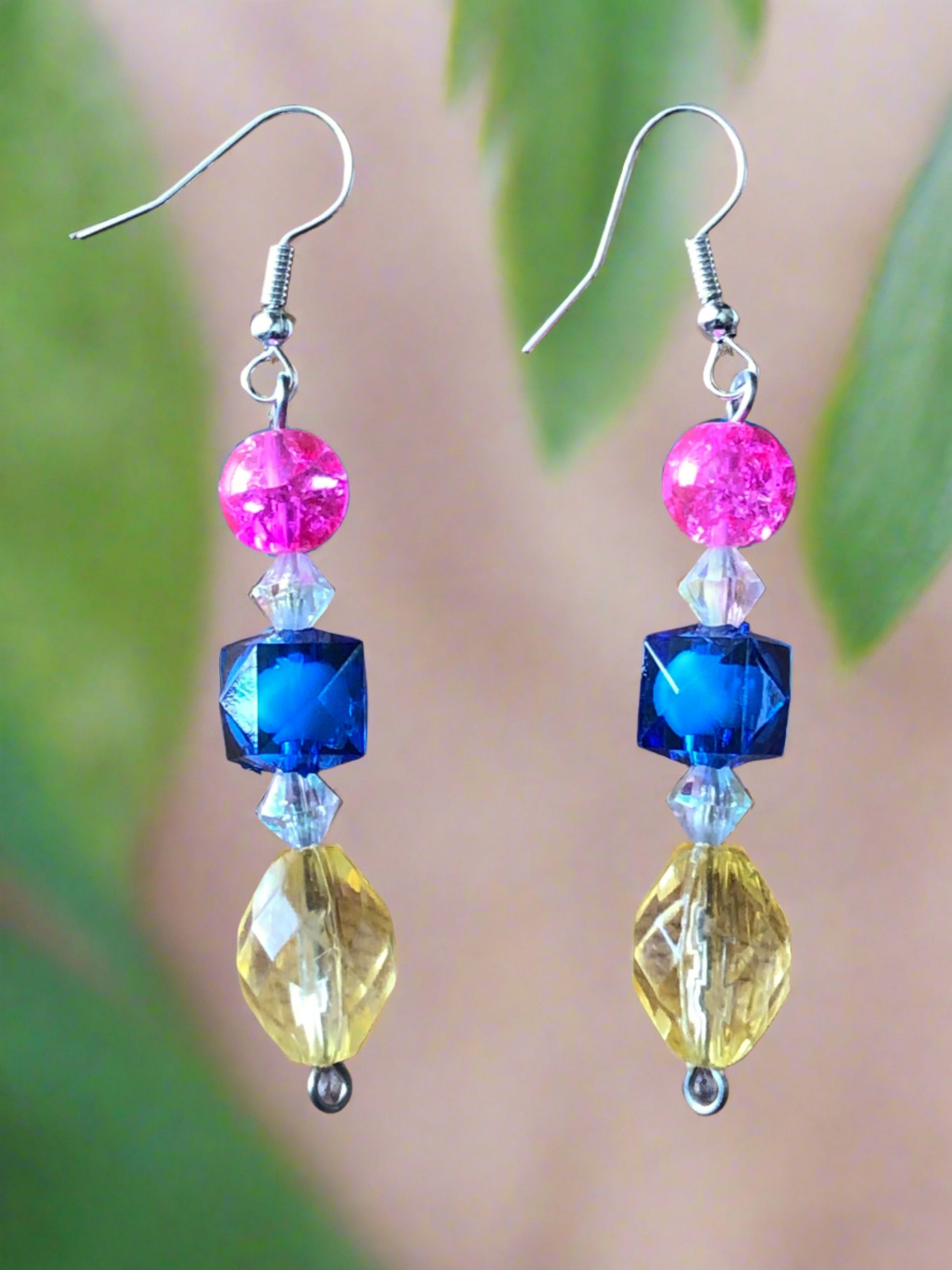 Crackled pink crystal round beads, faceted blue beads, yellow faceted beads and iridescent Bicone beads with hand-painted resin pendant with pressed flowers.