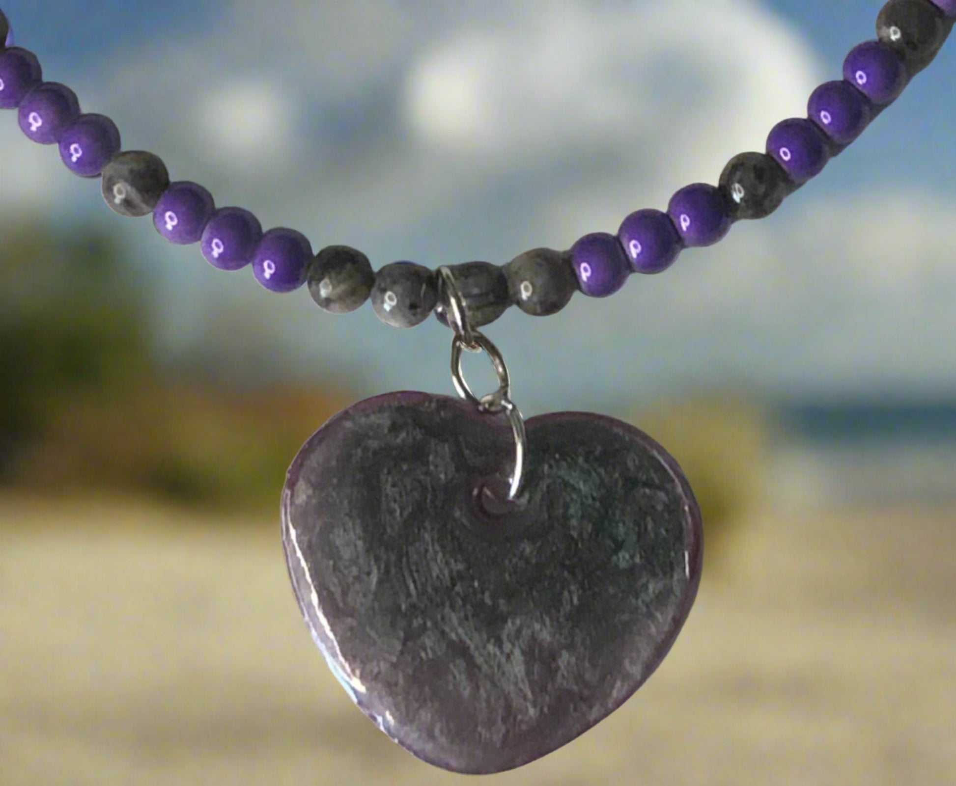Dark gray round beads and purple miracle beads with purple resin heart. It can be worn both sides.