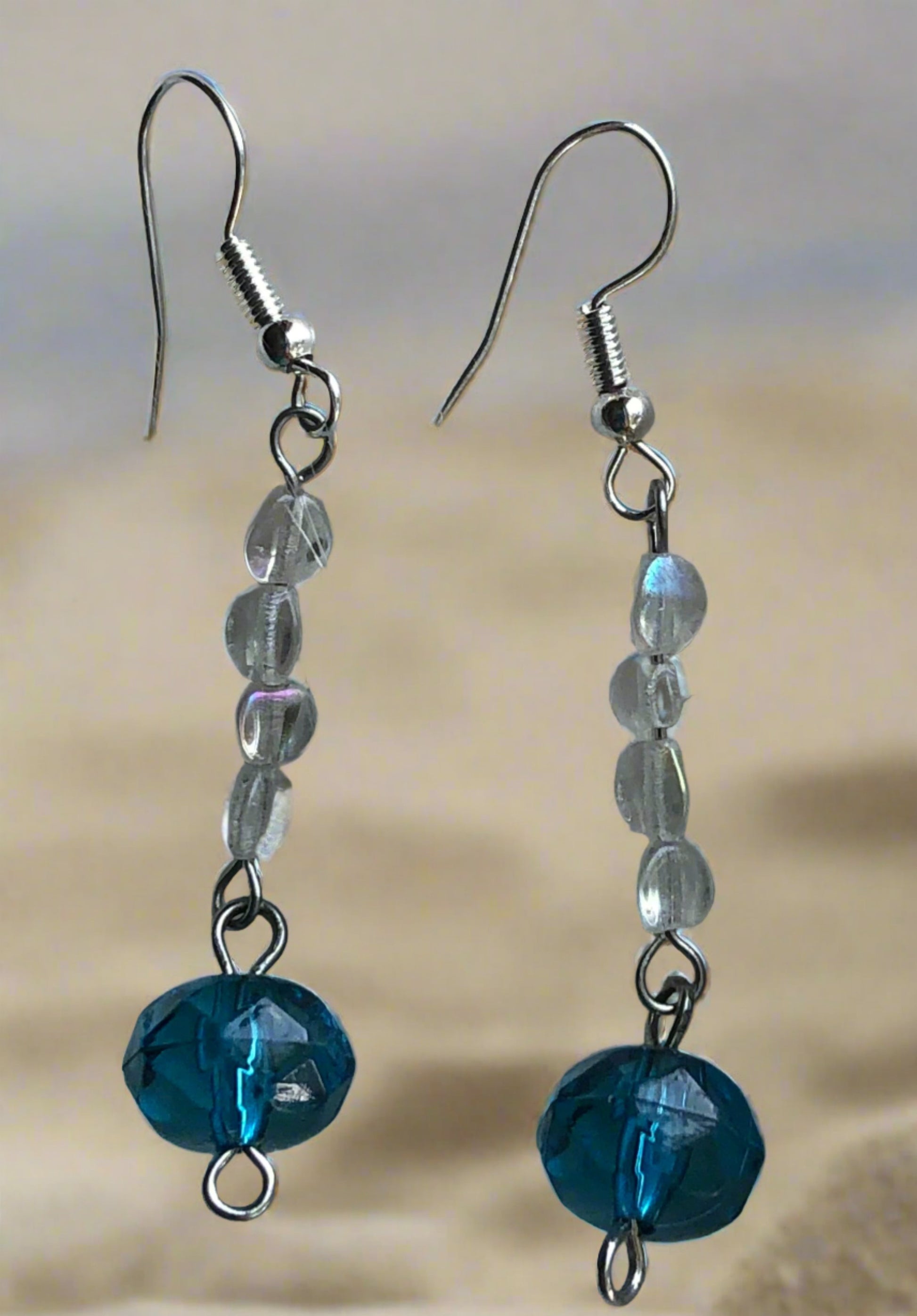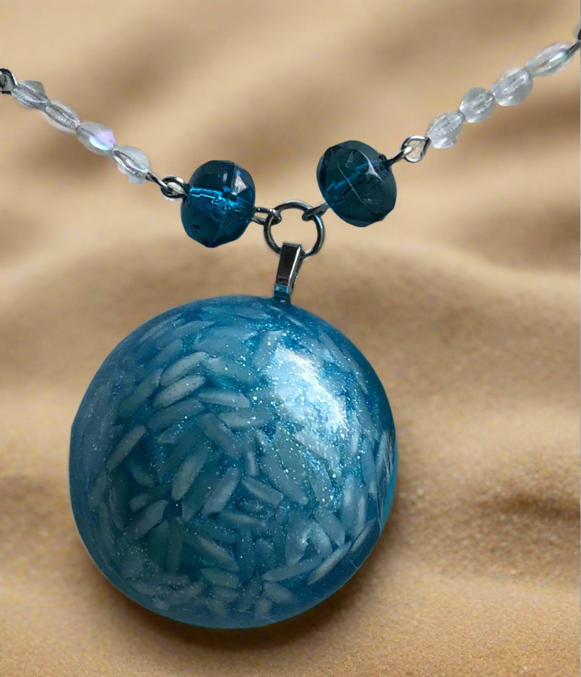 Mini iridescent crystals and faceted blue beads with freehand rice resin pendant.