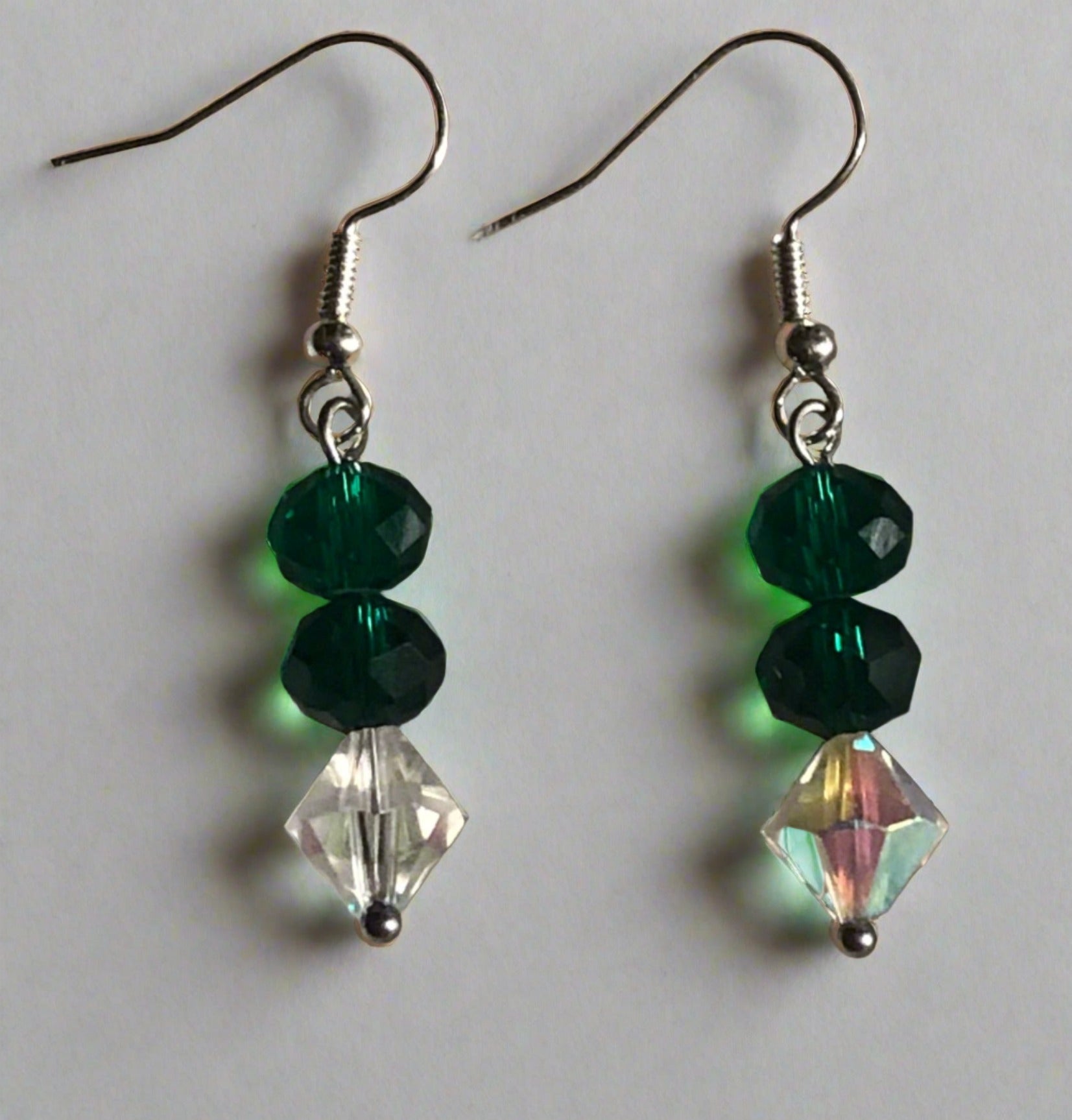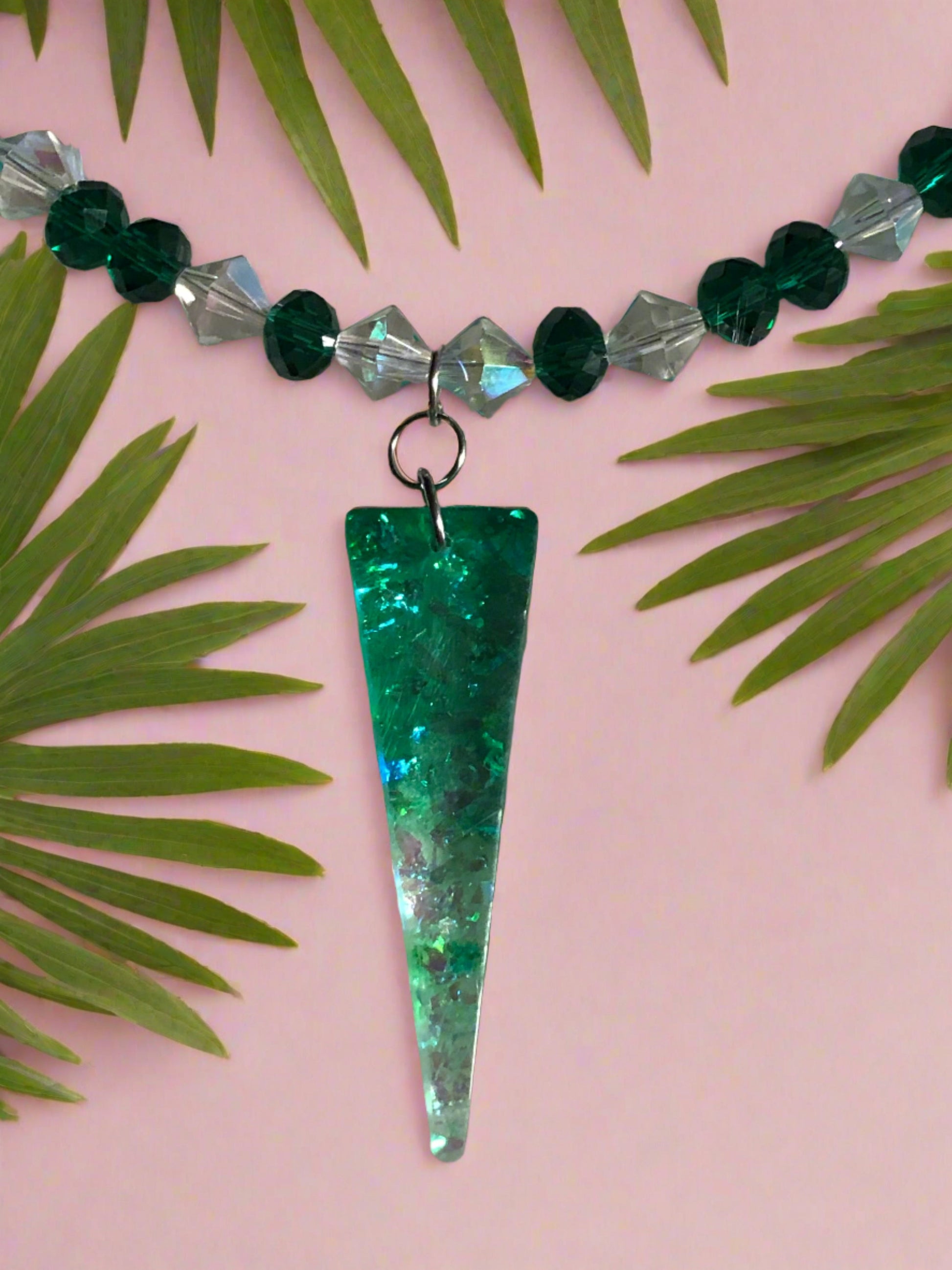 Silver chain, emerald green faceted beads, Bicone iridescent beads with Ombre style silver foiled resin pendant